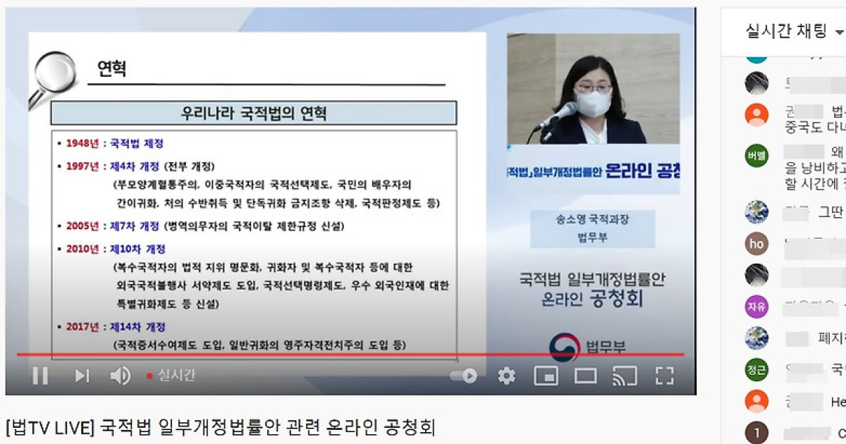 (광주=연합뉴스) 박철홍 기자 = 외국인 우수 인재의 국내 유치를 내용으로 하는 국적법 개정안이 발의됐다. 현재 국적법 개정안 입법 청원이 25만명이 되고 있습니다. 이처럼 국적법 개정에 대한 반대 여론이 확산하고 있는 가운데 법무부는 지난 27 유튜브를 통해 국적법 개정안 관련 온라인 공청회를 열었다. 법무부, '국적법 개정안' 논란에 특정 국가만을 위한 제도 아냐…아동 인권 논의는 빠져 az 불신 딛고… 사전예약자 98%가 병원을 찾았다 금주의 b컷반려견도 당당히 비행기 탑승권 받아 나란히 좌석 앉아 여행…꿈만 같아요 「국적법」을 개정하는 데에 그 개정이유와 주요내용을 국민에게 미리 알려 이에 대한 의견을 듣기 위하여 「행정절차법」 제41조에 따라 다음과 같이 공고합니다.